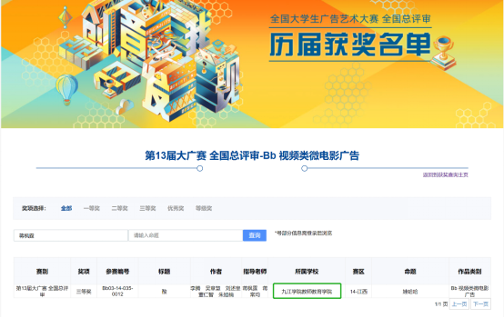 全国大学生广告艺术大赛(简称大广赛)由中国高等教育学会、教育部高等学校新闻传播学类专业教学指导委员会主办。大赛分为平面类、视频类、动画类、互动类、广播类、策划案类、文案类等多个类别,经过学校申报、专家评审等环节,评出一、二、三等奖和优秀奖。自2005年首次举办至今,是被权威机构认可的以“创意”为核心概念,以“创新”为育人目标的国家级大学生学科竞赛。本次大赛全国29个赛区共计1679所高校参赛,共提交作品481947项,参赛学生1292604人次。全国各赛区报送国赛作品共计36932项,其中国赛获奖5523项。