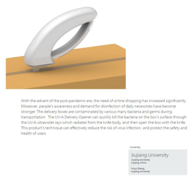 近日,永利yl23411集团官网艺术学院2018级本科生张昕宇的作品“UV-A Delivery Opener”入选2021年德国iF设计奖世界设计指南(iFWORLD DESIGN GUIDE),并被收录在学生概念单元(STUDENT CONCEPTS)。这是艺术学院产品设计本科生首次获得此类殊荣,创造了学生获得此类国际重要设计赛事荣誉的历史。以上作品由艺术学院教师李苒指导完成。
