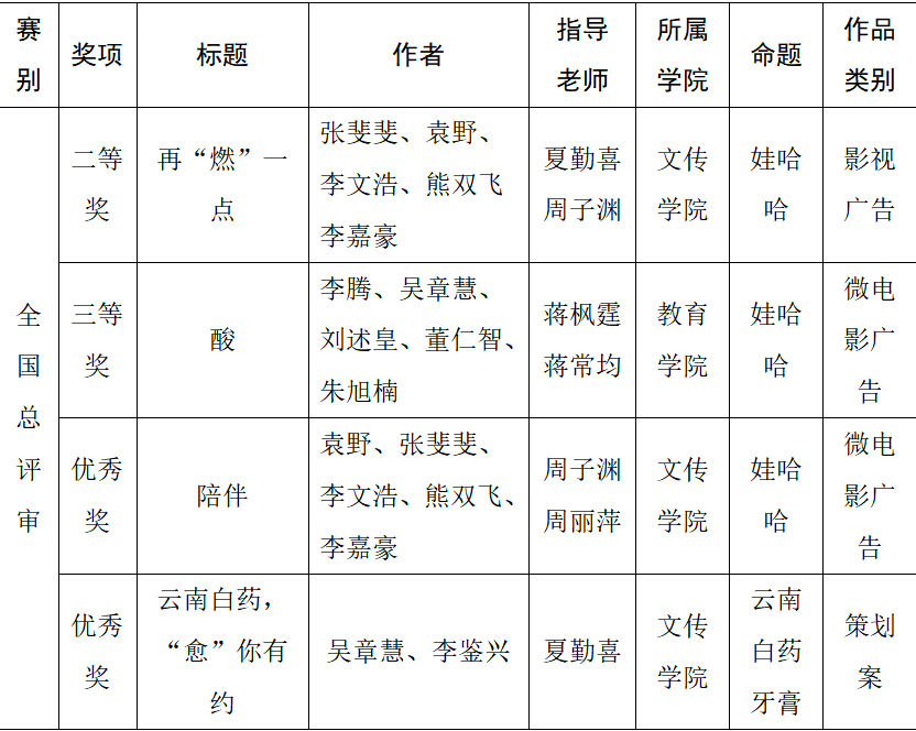 9月17日,第13届“全国大学生广告艺术大赛”(简称“大广赛”)官网公布全国总决赛获奖名单,永利yl23411集团官网文传学院、教育学院学子获二等奖1项,三等奖1项,优秀奖2项,创永利yl23411集团官网参赛历史最好成绩。