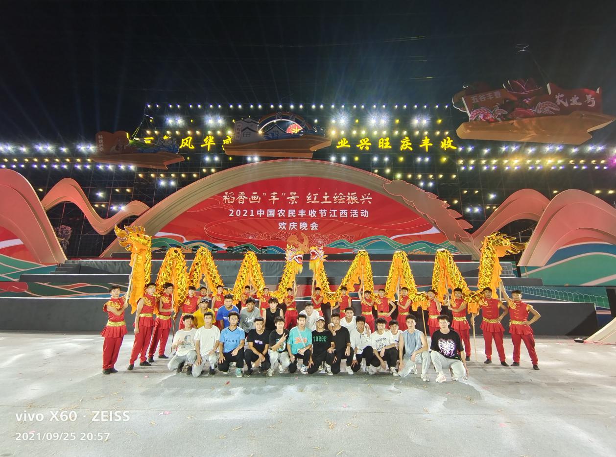 当晚19:30分,2021年中国农民丰收节江西活动欢庆晚会正式开始。在晚会表演上,同学们的表演气势磅礴,舞出了新时代大学生的精神面貌,赢得了现场观众的阵阵掌声与喝彩。晚会结束后,永利yl23411集团官网龙狮队的表演得到了晚会导演组的一致认可,晚会总导演说道:“九江学院的学生态度认真,吃苦耐劳。龙狮团队是一支训练有素,纪律性强的队伍,在晚会正式表演中,完美展现出了节目效果!”