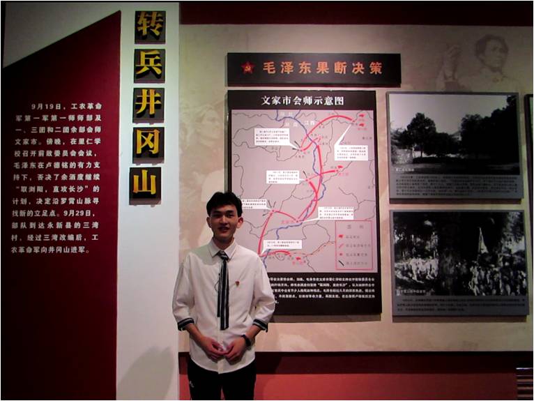 “当时毛泽东同志说要到敌人管不着或难管的地方去,到乡下去,到山上去,和农民一起,进行土地革命,保存和发展革命。也正是毛泽东同志的话,给处在危难中的工农革命军指明了方向。军队踏上了向井冈山进发的新征程,开启了探索革命道路的战略性转变。”参观第三展区“转兵井冈山”后,文学与传媒学院2018级薛宇聪同学这样感叹地说。他说,转兵井冈山体现了毛泽东同志把马克思主义基本原理与中国革命具体实际相结合,展现了毛泽东同志实事求是的作风和眼光远大的睿智,为全国革命斗争形成星火燎原的良好局势开辟了一条全新的道路。