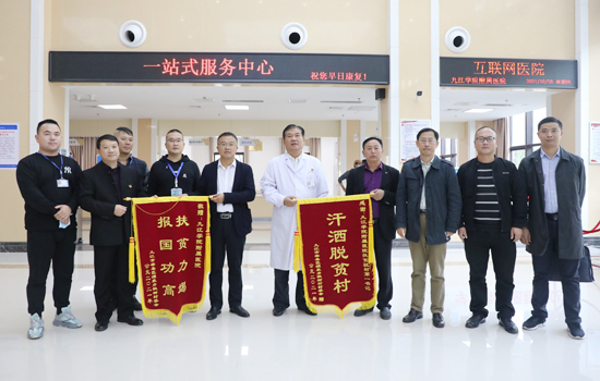 10月28日,柴桑区涌泉乡枫树村两委在涌泉乡党委书记杨运发,党委副书记、乡长吕清的带领下,专程来九江学院附属医院送上两面分别书有“扶贫力竭 报国功高”、“汗洒脱贫村”字样的锦旗,感谢附属医院党委、行政和驻村工作队对涌泉乡、枫树村的倾力帮扶。