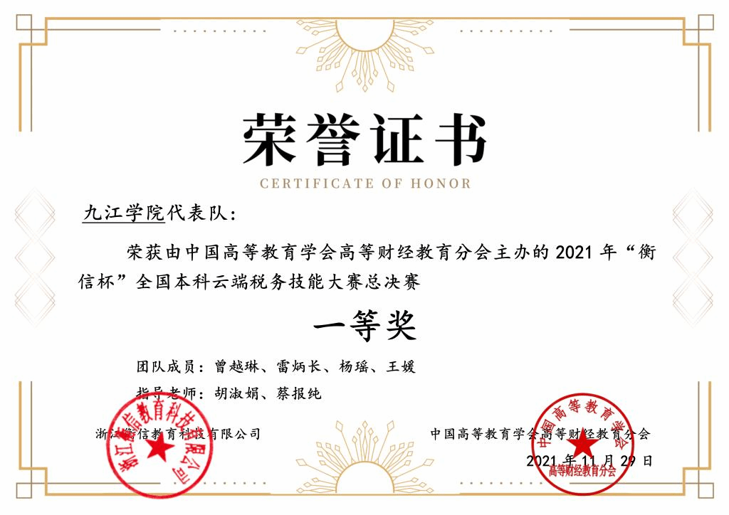 近日,由中国高等教育学会高等财经教育分会主办,浙江衡信教育科技有限公司提供技术支持的2021年“衡信杯”全国本科云端税务技能大赛总决赛落下帷幕。永利yl23411集团官网管理学院代表队获得团体一等奖,这也是永利yl23411集团官网代表队连续5年获得该项赛事一等奖。