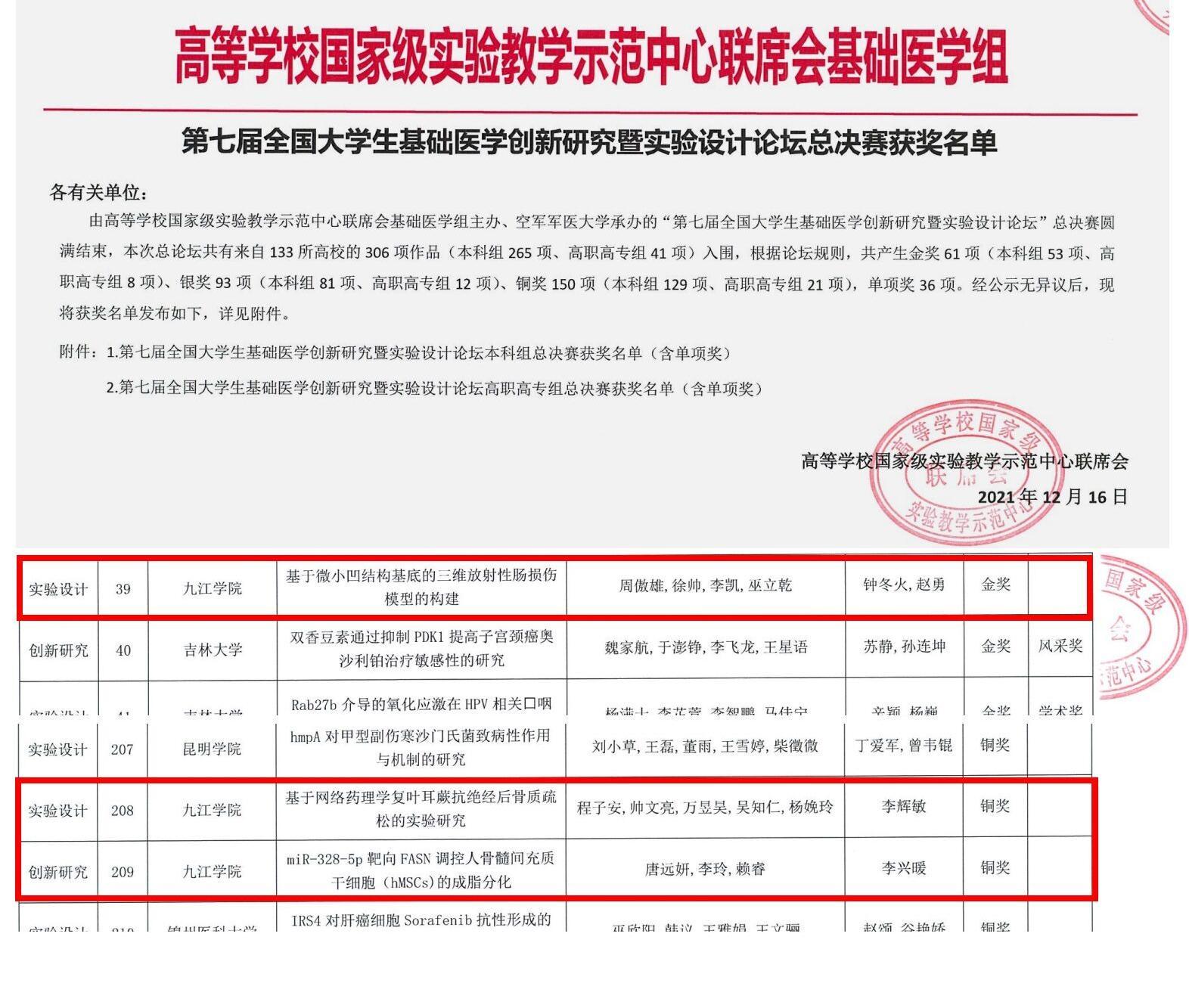 近日,在高等学校国家级实验教学示范中心联席会基础医学组举办的“第七届全国大学生基础医学创新研究暨实验设计论坛”总决赛中,永利yl23411集团官网医学院师生获得了1金2铜的优异成绩,实现了金奖零的突破。