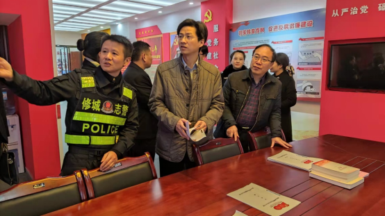 到达修水县后,学校帮扶工作领导小组一行首先实地查看了修水县多元调解服务中心,就“修城志警”“心理健康咨询”“矛盾纠纷多元化调解”等修水县平安建设工作及需对接帮扶的情况进行了实地考察调研。随后,工作小组一行会同省委军民融合办帮扶工作小组,在修水县多元调解服务中心召开了挂点帮扶平安建设工作推进座谈会。