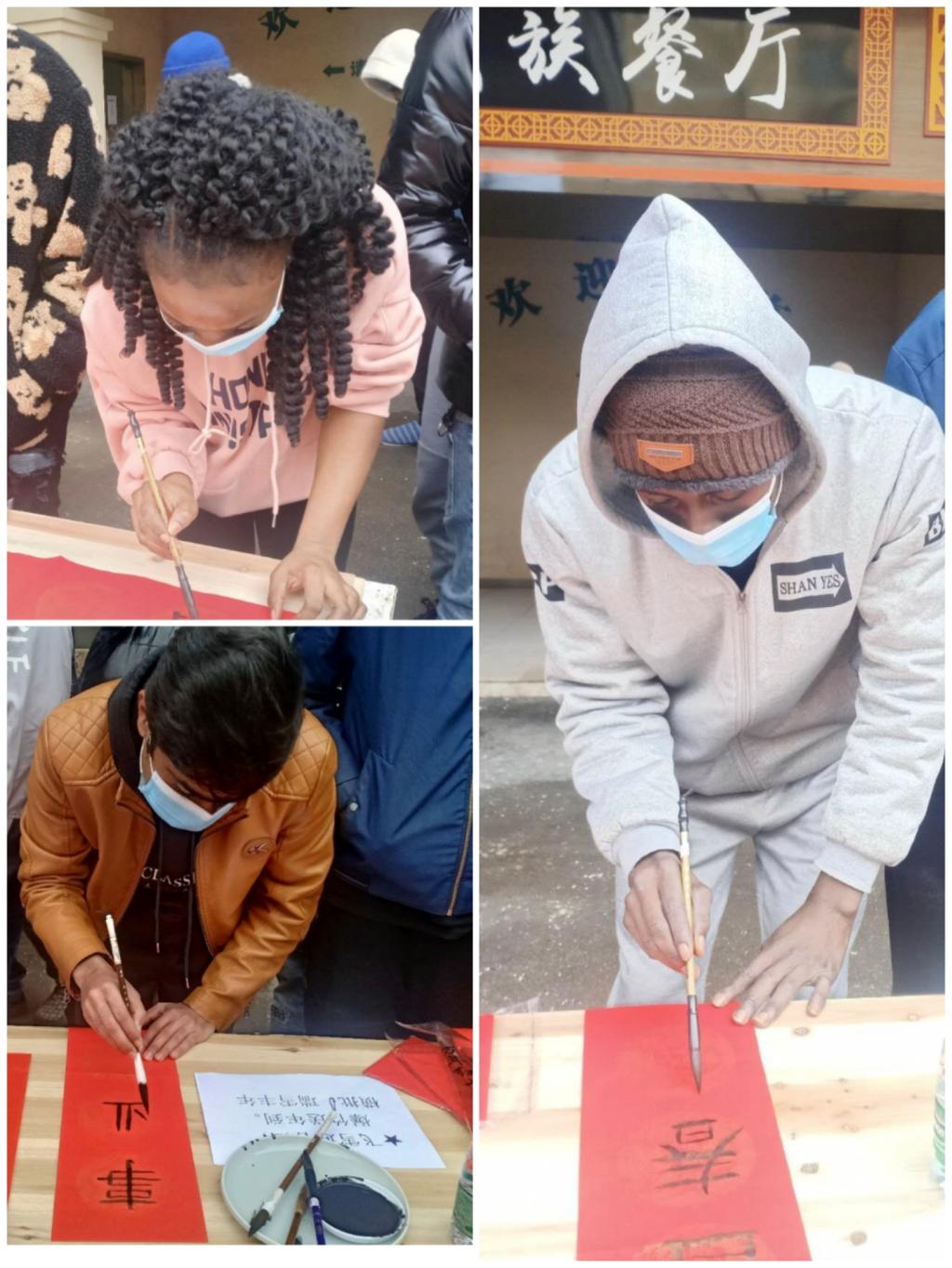 为了使留学生体验中国春节文化,国际交流学院还安排留学生学写春联。同学们积极参与,一笔一划,认真细致,不少同学写完后还不忘“秀”一下。学校还为留学生准备了新年礼物,领到礼物的同学兴高采烈,脸上洋溢着兴奋的笑容。
