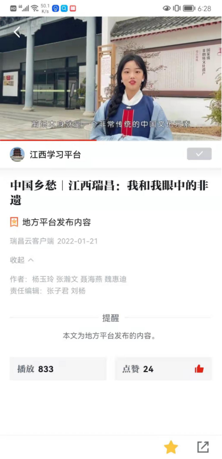 据悉,该团队为了拍出高质量的作品,一月初开始走访瑞昌市博物馆、文化馆、剪纸博物馆找寻瑞昌剪纸文化根源,探寻非遗剪纸遗迹。从前期策划、调研、学习到实地考察,共耗时两个多月。拍摄期间,团队还拜访了瑞昌剪纸非遗传承人朱朴光老师,继承和发扬老一辈民间艺人身上质朴的匠人精神。1月21日,学习强国“中国乡愁”板块发布了该视频作品。