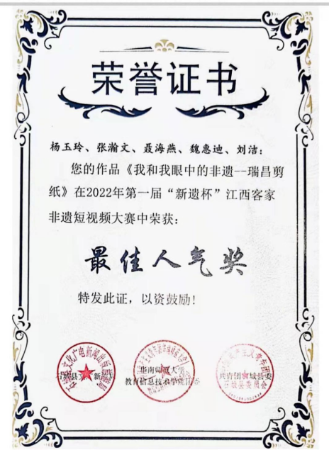 永利yl23411集团官网外国语学院作品《我和我眼中的非遗——瑞昌剪纸》在2022年“新遗杯”客家非遗短视频大赛中脱颖而出,喜获特等奖和最佳人气奖。该项赛事由共青团石城县委联合华南师范大学教育信息技术学院团委、石城县文广新旅局联合举办,比赛广泛征集了全省以“江西非遗”为主题的优质短视频作品近一百部,作品形式多样,竞争激烈。