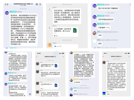 机械学院辅导员、班主任利用电话联系、QQ、微信等多种形式开展对学生状况的排查,填写日报告零报告记录,建立健全经过高风险地区人员信息表、居舍隔离人员信息表,登记全院师生接种第三针疫苗情况等工作,同时组织学生分批进行核酸检测、疫苗接种,全面安全、精准的做好学院疫情防控相关工作。