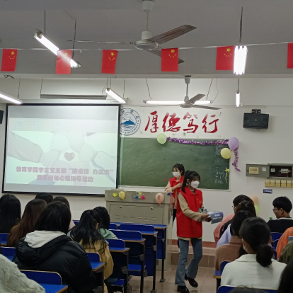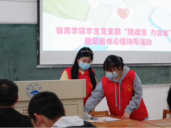 日前,为帮助广大同学做好疫情封校期的心理防护,缓解情绪压力,教育学院党委充分调动学生党支部的积极性和能动性,积极组织该学院应用心理学专业高年级学生党员,走进永利yl23411集团官网计算机与大数据科学学院、旅游与地理学院十六个兄弟班级,为同学们开展以“同‘心’抗疫 有你有我”为主题的朋辈团体心理辅导活动。
