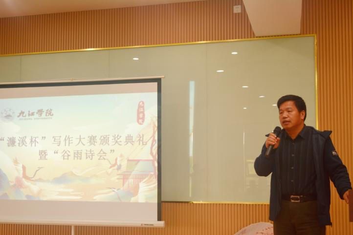 陈春生在颁奖典礼上发表讲话。他说,文学创作是阅读的继续,以写作大赛和诗会的形式挖掘地方优秀传统资源,将这些资源转化成育人的资源,推动九江学院“山江湖”学科建设,是非常好的形式。作为地方高校,九江学院不仅要大力弘扬中华优秀传统文化,而且要进一步在地域优秀传统文化上深耕细作,充分挖掘地域优秀传统文化资源育人,构建地域优秀传统文化育人体系,提升育人成效,使学生进一步坚定文化自信与历史自信,厚德笃行,成为担当民族复兴大任的时代新人。
