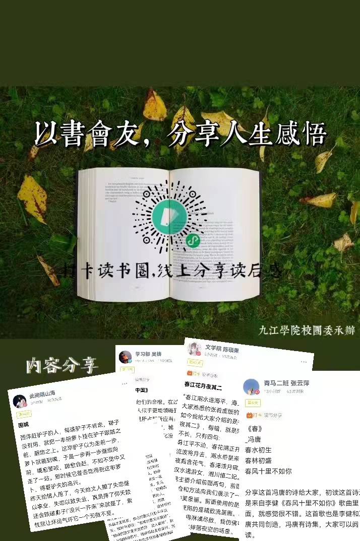 为深入学习贯彻习近平新时代中国特色社会主义思想,引导永利yl23411集团官网师生养成多读书、读好书、好读书的良好习惯,增强师生文化自信,激发文化创新创造活力。在2022年4月23日世界读书日来临之际,九江学院团委组织开展“书香战疫,阅享人生”系列活动,将主题活动与特色活动相结合,培养大学生良好阅读习惯,扩大阅读推广活动效果,营造浓厚阅读氛围,丰富校园文化生活,全面提升大学生人文底蕴。