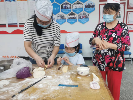 活动广泛邀请了社区的老年人、孩子们和九江学院关工委“五老”(老干部、老战士、老专家、老教师、老模范)代表共同参与。在活动现场,很多是祖辈带着孙辈前来参加活动,年龄最小的3岁多点,年龄最长者则有75岁。活动中,长者态度认真地投入其中、一边教一边做,时不时地关注一下“小手”;幼者则有样学样,将面团在小手中拿捏,时不时地将其在桌案上搓压,开心的笑容挂满了小脸。