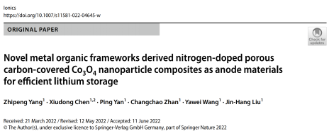 近日,永利yl23411集团官网化学化工学院2019级应用化学专业本科生杨志鹏同学,在该学院教师陈修栋博士和刘金杭博士共同指导下以第一作者身份在国际SCI刊物《Ionics》(影响因子2.817,中科院分区:三区)上发表题为“Novel metal organic frameworks derived nitrogen‐doped porous carbon‐covered Co3O4nanoparticle composites as anode materials for efficient lithium storage”的研究论文。