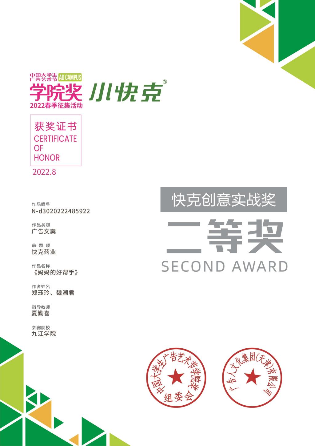 中国大学生广告艺术节学院奖是全国性的大学生广告专业奖项,参与院校超过1500个,年度参与人数和作品数均超100万,每年分为春秋两季,本次春季赛共设金奖73项,银奖113项,铜奖190项及若干企业特别奖,旨在号召全国各高校大学生为国内外知名企业进行命题式创意,也是广告、市场营销、传播艺术、设计、新媒体、动画等相关专业学生打造专业的大学生创意活动,在中国传播与广告相关专业院校、学生中间具有广泛的影响力。
