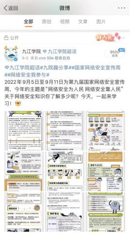 疫情期间,为尽量减少人员聚集,学校充分利用网络平台,调动各二级学院的力量,广泛深入开展网络安全宣传教育活动。学校党委宣传部积极组织师生参加2022江西省网络安全知识竞赛,编印纸质宣传册发放给师生,并通过校园网、官方微信、微博、QQ发送网络安全宣传内容,各二级学院及时进行转发宣传,进一步增强了师生网络安全意识,提升了师生网络安全防护技能。