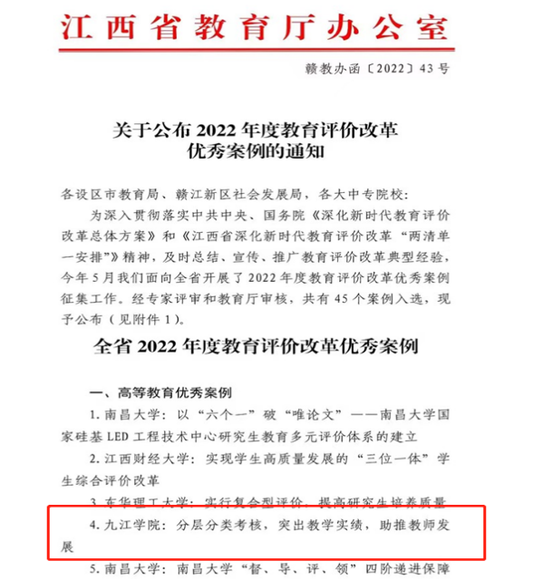 近日,省教育厅公布了江西省2022年度教育评价改革优秀案例征集评选结果,全省共有45个案例入选,其中高等教育优秀案例14个,永利yl23411集团官网《分层分类考核,突出教学实绩,助推教师发展》案例成功入选。