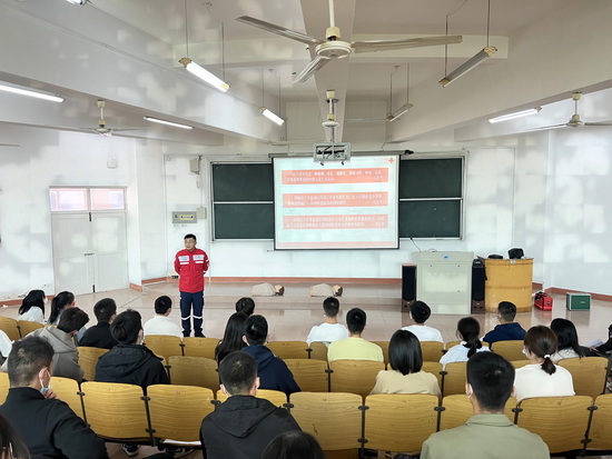 活动严格落实新冠肺炎疫情防控要求,采取线上与线下相结合的方式进行。在竞知楼举行的线下讲座中,钱逢鑫主任讲解了心肺复苏、气道异物梗阻等专业知识;解答了学生提出的急救知识方面的问题;现场进行了心肺复苏实操练习,演示应急救助的基本流程以及注意事项,并邀请同学上台进行有效互动。现场还播放了《心脏骤停急救》《气道异物梗阻急救》等应急救护知识专题片。