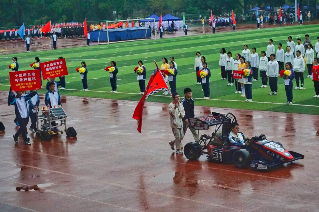 《奇迹再现》舞蹈加上方程式赛车,机械学院的方阵队表演吸引了在场观众,大家也纷纷跟着歌曲欢呼起来。参加方阵队表演的机械学院A2231汤子松介绍道,前面的方程式赛车是机械学院制作的,后面两台分别是小型半自动柠条机和全自动草方格铺设固沙车,均获得全国机械设计创新大赛一等奖。“选择歌曲《奇迹再现》,是希望机械学院的学子可以相信奇迹,创造奇迹,继续为学院和学校争取荣誉!”
