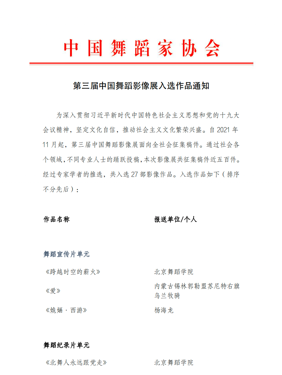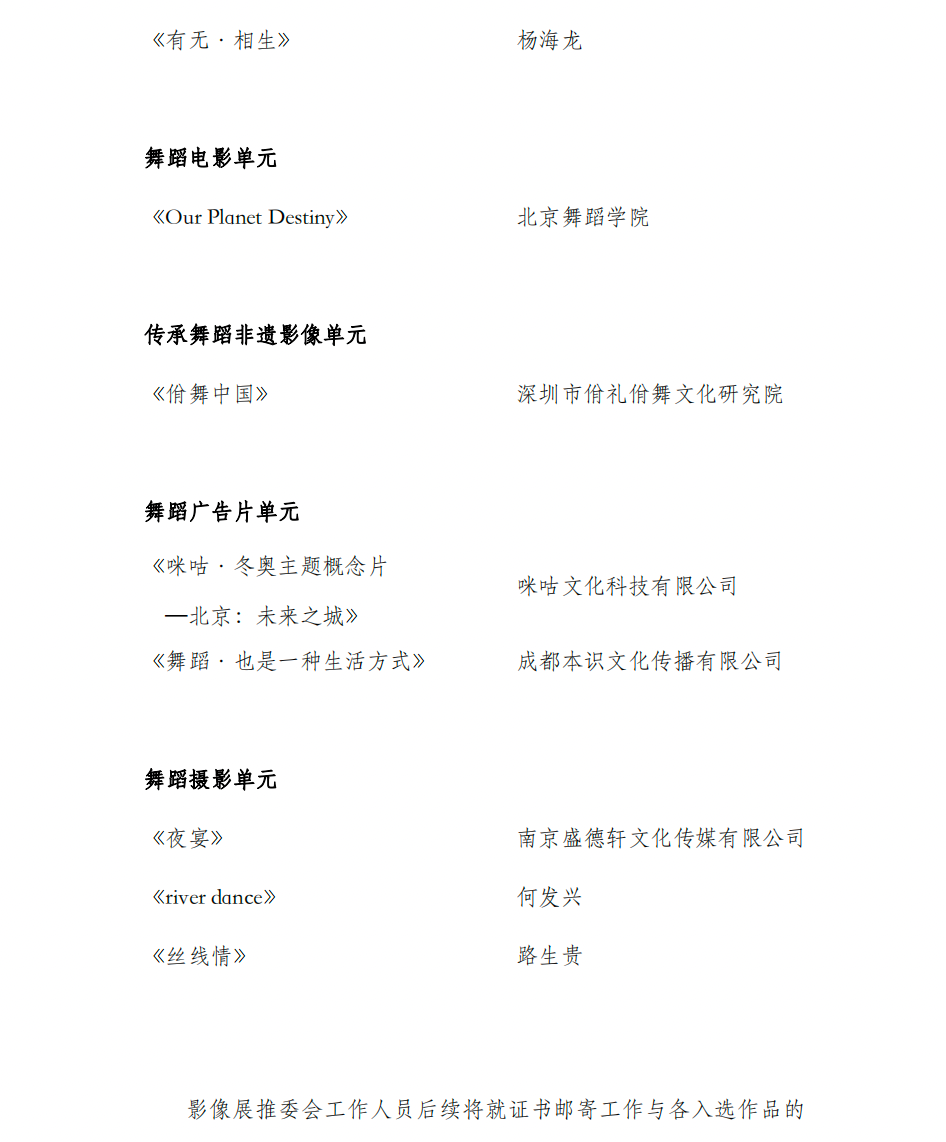 中国舞蹈家协会举办“中国舞蹈影像展”,旨在将舞蹈艺术、影像艺术、视觉艺术于一体的新媒体展现方式带给观众,透过舞蹈影像平台给予众多编导、舞者及导演在银幕上更多的尝试和探索。自2016年启动以来,中国舞蹈影像展面向全国征集作品,受到国内众多舞蹈影像创作者的关注。
