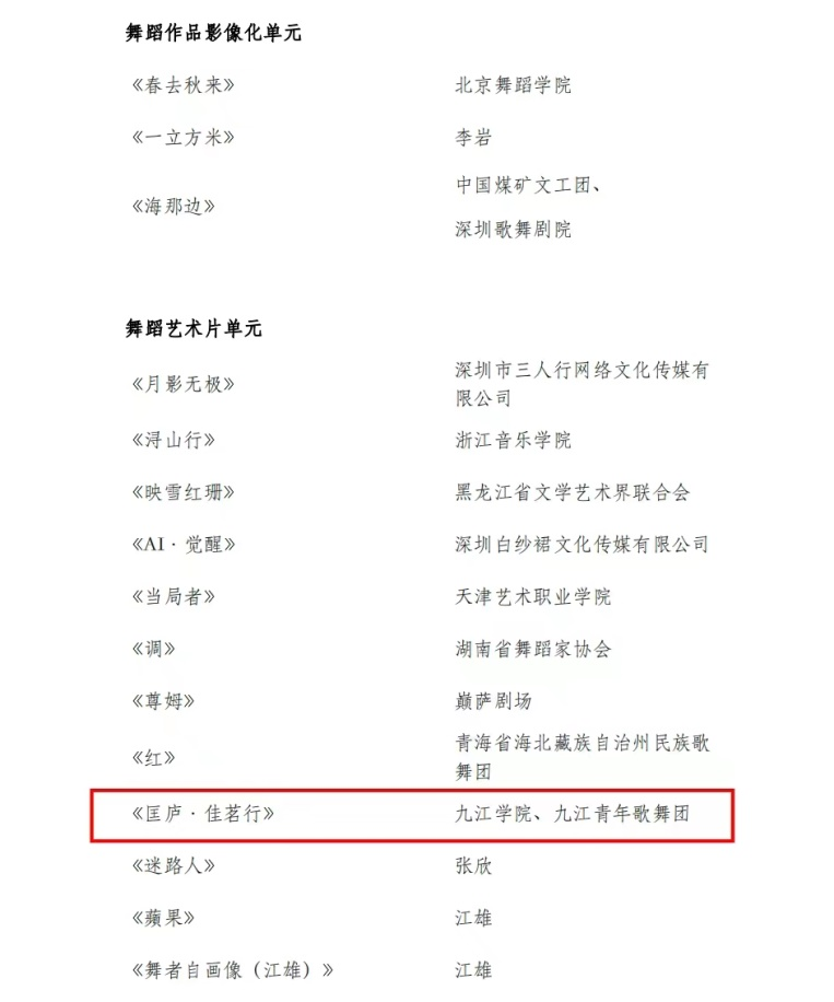 近日,中国舞蹈家协会公布“第三届中国舞蹈影像展入选作品”名单。九江学院、九江青年歌舞团选送的原创舞蹈《匡庐·佳茗行》 入选其中的“舞蹈艺术片单元” 名单。这也是江西省在此届舞蹈影像展中唯一入选作品。这是该作品继获2021年江西省文化艺术基金(一般项目)资助,并获江西省第六届大学生舞蹈节二等奖之后,在全国舞蹈专业比赛的竞争中取得的一项殊荣。
