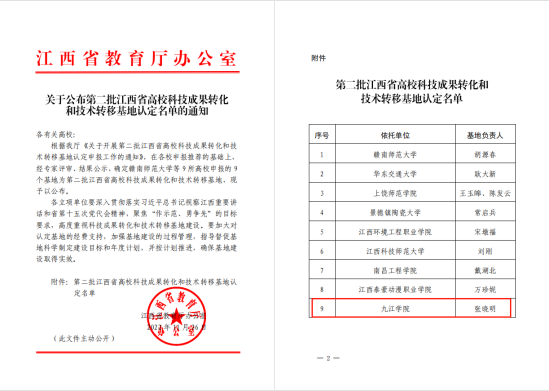 近日,根据江西省教育厅印发的《关于公布第二批江西省高校科技成果转化和技术转移基地认定名单的通知》,永利yl23411集团官网通过专家评审,成功获批为江西省高校科技成果转化和技术转移基地。