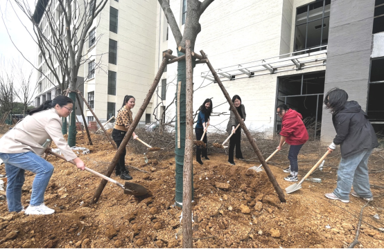 春日的紫薇园校区,处处挥洒着热火朝天的劳动场面。党员同志们来到紫薇园的绿化地,齐心协力,悉心为红榉木挥锹填土、踩实压紧,在现场专业人员的指导下,认真完成每一道工序。