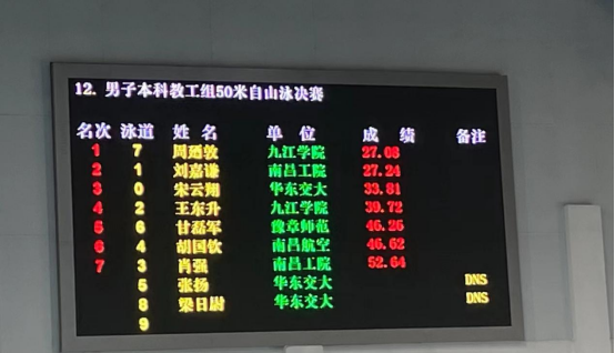 江西省第十六届运动会游泳(高校组)比赛于近日在九江市湖口县顺利举行。教工组参赛队员王东升、周廼敦代表九江学院参加了此次比赛,取得了教工组三个第一、一个第四的优异成绩。