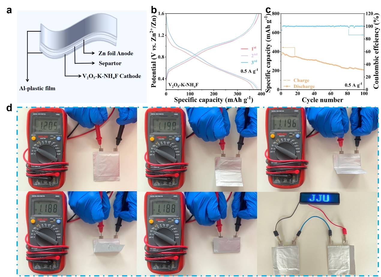 针对这一行业痛点,永利yl23411集团官网科研团队创新提出金属有机框架(MOFs)衍生和双离子协同插层的改性策略。通过水热合成与高温煅烧工艺,以钒基金属有机框架为前驱体制备层状V2O5,再通过二次水热过程将K⁺和NH4⁺双离子协同插入其晶格中,成功制备出V2O5-K-NH4F复合正极材料。该策略通过双离子的协同作用,实现了三重优化效果:一是将V2O5的层间距从4.37 Å大幅拓展至10.69 Å,为锌离子迁移提供畅通通道;二是K⁺与NH4⁺形成 协同支柱效应,有效抑制钒溶解和结构坍塌;三是通过氢键作用和电子结构调控,提升材料导电性和反应动力学。