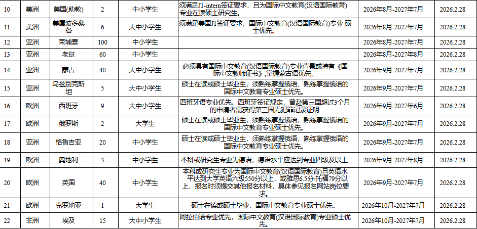 1.2026年本科及以上毕业生,在读研究生,国际中文教育志愿者项目的往届志愿者,部分岗位可接受中小学在职教师。鼓励掌握赴任国语言、专业为国际中文教育(汉语国际教育)、具有教学经验、具有中华才艺特长、持有《国际中文教师证书》者踊跃报名;