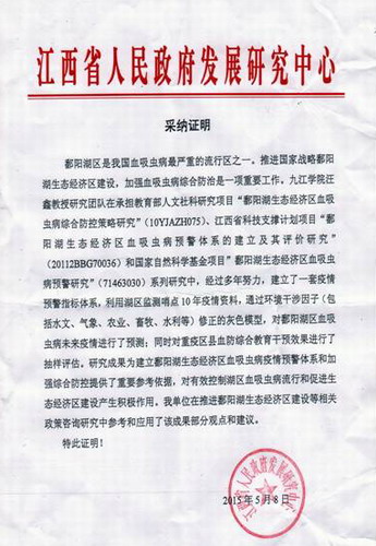 永利yl23411集团官网基础医学院汪鑫教授研究团队在承担教育部人文社科研究项目“鄱阳湖生态经济区血吸虫病综合防控策略研究”、江西省科技支撑计划项目“鄱阳湖生态经济区血吸虫病预警体系的建立及其评价研究”和国家自然科学基金项目“鄱阳湖生态经济区血吸虫病预警研究”系列研究中,经过多年努力,建立了一套疫情预警指标体系,研究成果为建立鄱阳湖生态经济区血吸虫病疫情预警体系和加强综合防控提供了重要参考依据,相关研究成果已被江西省人民政府发展研究中心采纳。