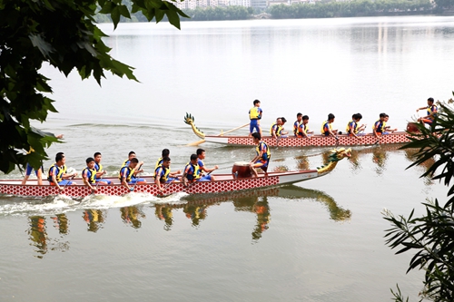 随后,两支龙舟队员们,手提木桨走上龙舟,坐在龙舟中,等待发令。在骄阳下,队员们个个英姿飒爽,精神焕发。随着甘筱青校长一声令下:我宣布庆端午龙舟表演赛,现在开划!两支龙舟,如同两支箭,在如镜的水面上,划出两条水波,队员们在鼓声中,奋力划桨,勇往直前。湖畔上,驻足观赏的人们拿着手机,纷纷拍照,记录这最精彩一瞬间,让中国传统的端午佳节多了一份喜悦和快乐。