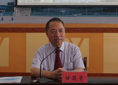 校长甘筱青代表学校致欢迎辞,他对来到九江学院进行中国文化体验的柬埔寨王家学院孔子学院官员班访华团表示热烈的欢迎。他说,中国和柬埔寨两国关系一贯友好,文化交往源远流长。2009年12月22日,时任中国国家副主席习近平阁下与柬埔寨副首相索安阁下为孔子学院揭牌,称赞它是“中柬文化交流的里程碑”。我们欣喜地看到,孔子学院自运营以来,汉语教学不局限于王家学院,还涉及总理府、参议院、部队、军校、警校及大中小学校,全面服务于两国的友好合作。九江学院将继续与柬埔寨王家学院精诚合作,发展和柬埔寨各地、各个机构的合作,稳步建设好孔子学院、孔子课堂。他对柬埔寨孔子学院官员班学员为孔子学院的发展提供的支持和帮助表示感谢,并相信在大家的共同努力下,孔子学院将会发展的越来越好,中柬友好交流将会迎来更加美好的明天!最后,祝愿各位团员在中国学习、生活愉快,满载而归!
