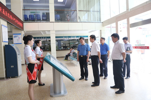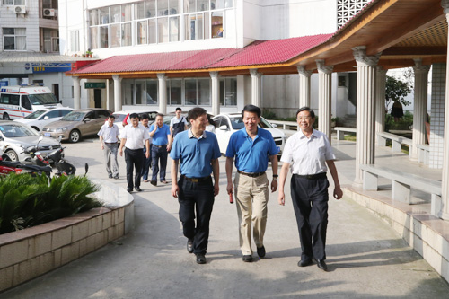蒋如铭一行在张院长、张书记的陪同下,参观了临床医学院/附属医院焕发新面貌的新门诊大楼、整洁舒适的特色病区、美观温馨的VIP病房,流程规范的手术室、供应室,位列省内外先进的消化内镜室、介入室、磁共振室等和即将建设完成的西院南门乳腺中心、特色门诊楼、家化式病区等处,并视察了临床医学院/附属医院门急诊诊疗水平、住院服务质量、中医药综合服务及康复医疗服务能力等工作。