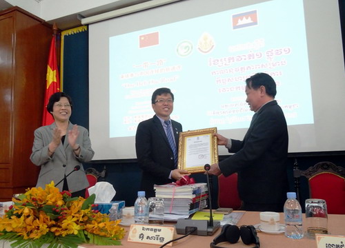 王家研究院院长、孔子学院理事长克罗提达院士表示,由中国国家主席习近平提出的“一带一路”是中国在21世纪的新战略,新思潮。这个战略的实施将给世界和柬埔寨人民带来好处。洪森总理在雅加达会见习近平主席时就强调,柬埔寨政府支持“一带一路”战略的实施,并且高度评价“一带一路”建设将给地区国家和人民带来发展的新机遇。作为王家研究院院长,我喜欢研究中国的政治与经济,我的博士学生也在做中国的研究,感谢孔子学院谢莫尼勒院长的努力工作,王家研究院已成为中柬人文交流的重要桥梁。