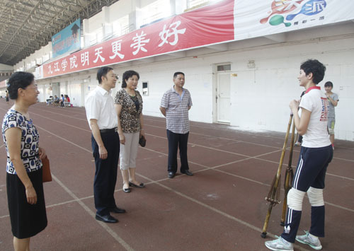 第十届全国少数民族传统体育运动会开战在即,参加本届民运会的江西代表团运动员、教练员正在永利yl23411集团官网积极备战。8月2日上午,九江市政协副主席、市委统战部部长黄大明来到永利yl23411集团官网,在学校副校长吴桃娥的陪同下,看望了全体运动员、教练员。