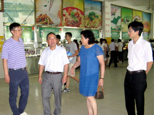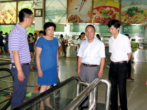 9月2日上午,校长甘筱青、副校长吴桃娥在组织人事部部长查振华、后勤管理处处长姜东升陪同下,来到主校区学生三食堂检查指导食堂迎新准备工作。