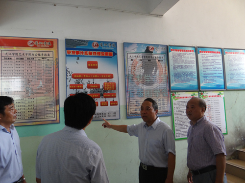 在34栋艺术学院学生宿舍,整洁的走廊里看不见一片垃圾,空气也清新了许多。甘校长对艺术学院宿舍管理制度上墙的做法十分赞赏。学生管理干部和班主任联系方式、突发事件处置流程等均张贴在醒目位置,甘校长指出“这一做法值得推广”。在与艺术学院的同学们交流的过程中,甘校长勉励大家随手清理宿舍垃圾,养成好习惯。
