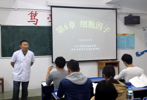 课堂上,周小鸥老师首先从我国第一个自然科学领域诺贝尔得奖女科学家屠呦呦和清华大学副校长、生物学家施一公事迹,引入本节课内容,生动的讲解了细胞因子的发展过程、分类及特性。授课过程中,周小鸥老师不时走下讲台与同学们互动,课堂气氛活跃。陶副校长在课堂上聚精会神,认真地做着笔记。