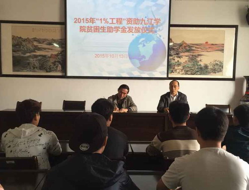 10月13日上午, 2015年度“1%工程”资助九江学院贫困学生助学金发放仪式在永利yl23411集团官网厚德楼415会议室举行。校学生资助管理中心主任潘建华,民进九江市委会副主委、九江学院总支主委赵追和本次受到资助的学生出席发放仪式。