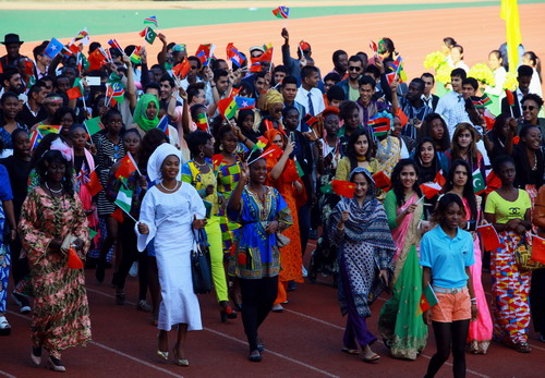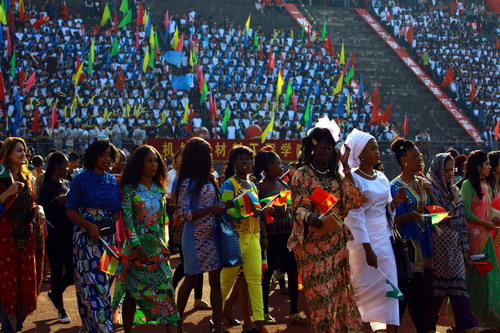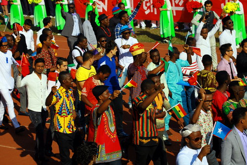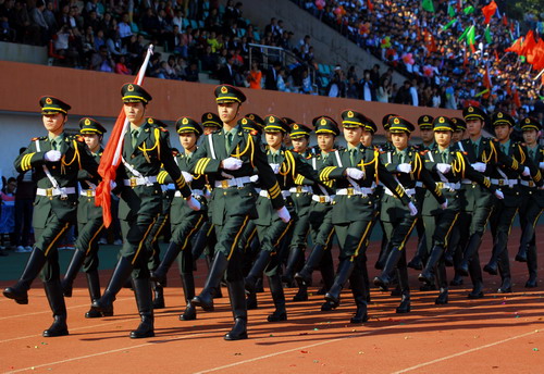国际交流学院的留学生代表队他们身着亮丽的民族服饰,手捧鲜花,顺着跑道向大家走来,并伴着欢快音乐跳起特色的舞蹈,总会成为全场的一道亮丽的风景线。