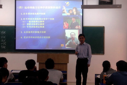 马老师本次课程讲授的主要内容是“运动训练方法与手段创新的途径”,他从运动训练的基本作用和适用范围出发,为同学们一一讲解了各种不同的运动训练方法,并围绕训练方法的基本理论对训练手段的创新与同学们进行了深入探究。