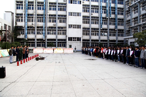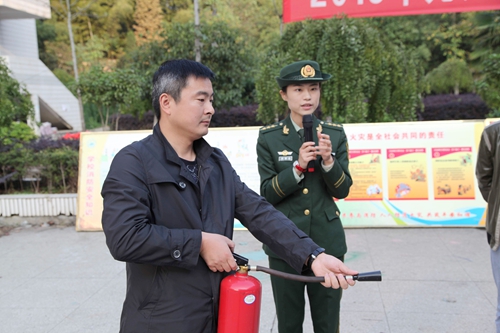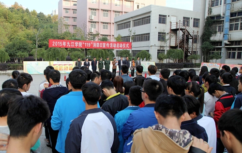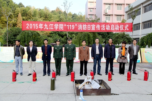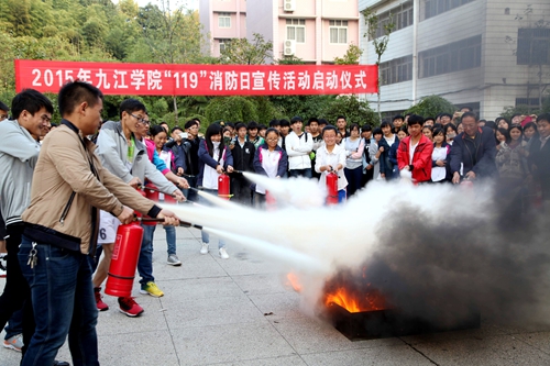 在第二十五个“119”消防宣传日的到来之际,11月4日下午,永利yl23411集团官网2015年119消防宣传月启动仪式在向学广场举行。校纪委书记魏立平、庐山区消防大队参谋邓雨欣,校保卫处、学生处、文传学院、理学院、会计学院、化环学院等部门负责人及学生代表约400余人参加了此次消防宣传及运用消防器材进行灭火的演练活动。