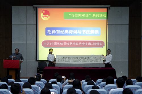 为深入推进“四进四信”活动,贯彻落实一二七计划,11月6日晚,中国毛体书法艺术家协会主席梅楚安做客永利yl23411集团官网“与信仰对话”专题讲堂,在文友楼报告厅带来题为“毛泽东经典诗词与书法解读”的精彩讲座。讲座前,副校长吴桃娥接见了梅楚安主席。学生处、校团委负责同志及学生代表500余人参加了讲座,讲座由校团委书记闫来英主持。