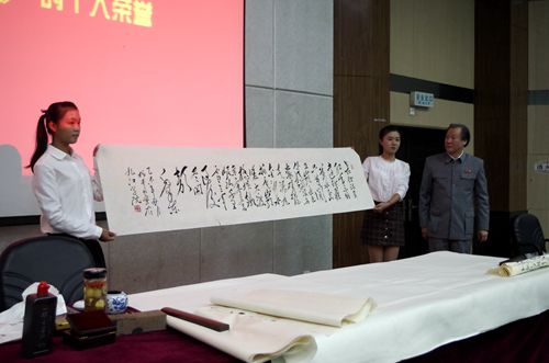 讲座结束后,同学们还围拢在梅先生身边请教,近距离欣赏他的书法作品。大家纷纷表示梅先生年近古稀,宣传红色文化的劲头值得年轻人学习,此次讲座不仅是一次文化艺术大餐,也是一堂生动的爱国主义教育课。青年学生一定会写好中国字,做好中国人,践行中国梦。