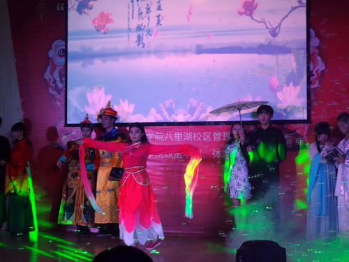 春风传喜讯、金猴踏歌来。12月22日晚七点,八里湖校区报告厅张灯结彩,一片祥和喜庆的景象。由八里湖校区管理办公室主办,体育学院、政法学院协办的2016年元旦迎新晚会在此盛大开幕。副校长陶春元出席晚会。校党委宣传部部长冯健、学生处处长刘平,八里湖校区管理办公室、体育学院、政法学院、八里湖新区公安分局的党政领导与八里湖校区师生欢聚一堂,一同观看了这场精彩的晚会。