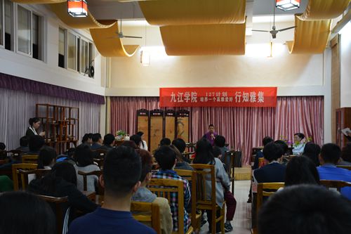 活动现场,副校长王万山发表了讲话。他说,一场雅集也是一次中国传统文化的学习之旅,行知雅集是九江学院127课外培养计划的重要载体。这个平台不仅拓展了“授业、传道、解惑”的“道场”,也营造出“云蒸霞蔚、香烟氲氤”的人文气场。他还结合自己的经历分享对艺术的见解,他说,人的幸福和梦想,都离不开人的“精神家园”,希望同学们要弘扬中国优秀传统文化,培养一个高雅爱好,守护好自己的精神家园。