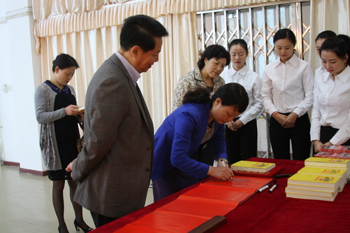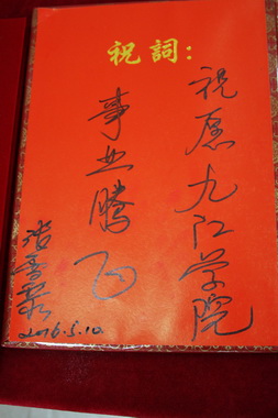 上午,专家组一行在校党委书记郑翔、副校长吴桃娥的陪同下,先后来到校友事迹展厅和大学创业园参观,认真听取了相关介绍,张雪黎组长受邀欣然为校友事迹展厅题词:祝愿九江学院事业腾飞。