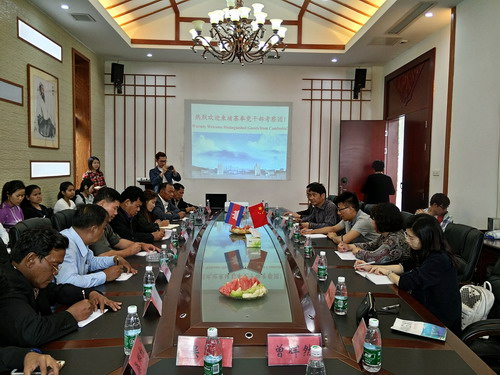 5月18日下午,以柬埔寨奉党副秘书长、菩萨省副省长比韩(H.E. Mr. Pich Han)为团长的柬埔寨奉辛比克党干部考察团在中联部张昊尊处长、省外侨办周丹副处长、市外侨办曾晖然副调研员等陪同下访问永利yl23411集团官网,永利yl23411集团官网国际交流处王贤淼副处长、国际交流学院夏修龙院长和庐山文化中心常务副主任李宁宁等热情的接待了来访嘉宾。欢迎仪式在庐山文化中心会议室举行。