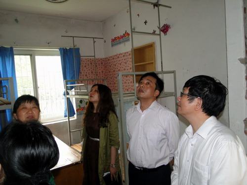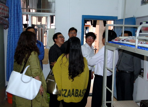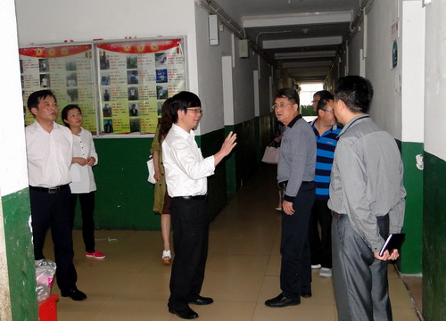 王副校长一行首先来到主校区学生宿舍3栋检查,察看了宿舍的安全设施。他要求宿舍管理部门加强卫生管理,及时清除垃圾,同时要对存在安全隐患的部位及时进行整修。在学生宿舍5栋,王副校长检查了部分宿舍的柜子维修情况,要求尽快维修,并做好宿舍内脱落墙面的维修工作。在学生宿舍5栋的外墙上发现有许多小广告,影响校容校貌,王副校长希望宣传部门加强管理,督促包干部门及时清理,还校园一个整洁的形象。在学生宿舍30栋检查时,王副校长对宿舍卫生表示满意,同时要求宿管部门对楼道里破损的磁砖和已经生锈的楼梯不锈钢扶手及时进行维修和更换,以消除安全隐患。